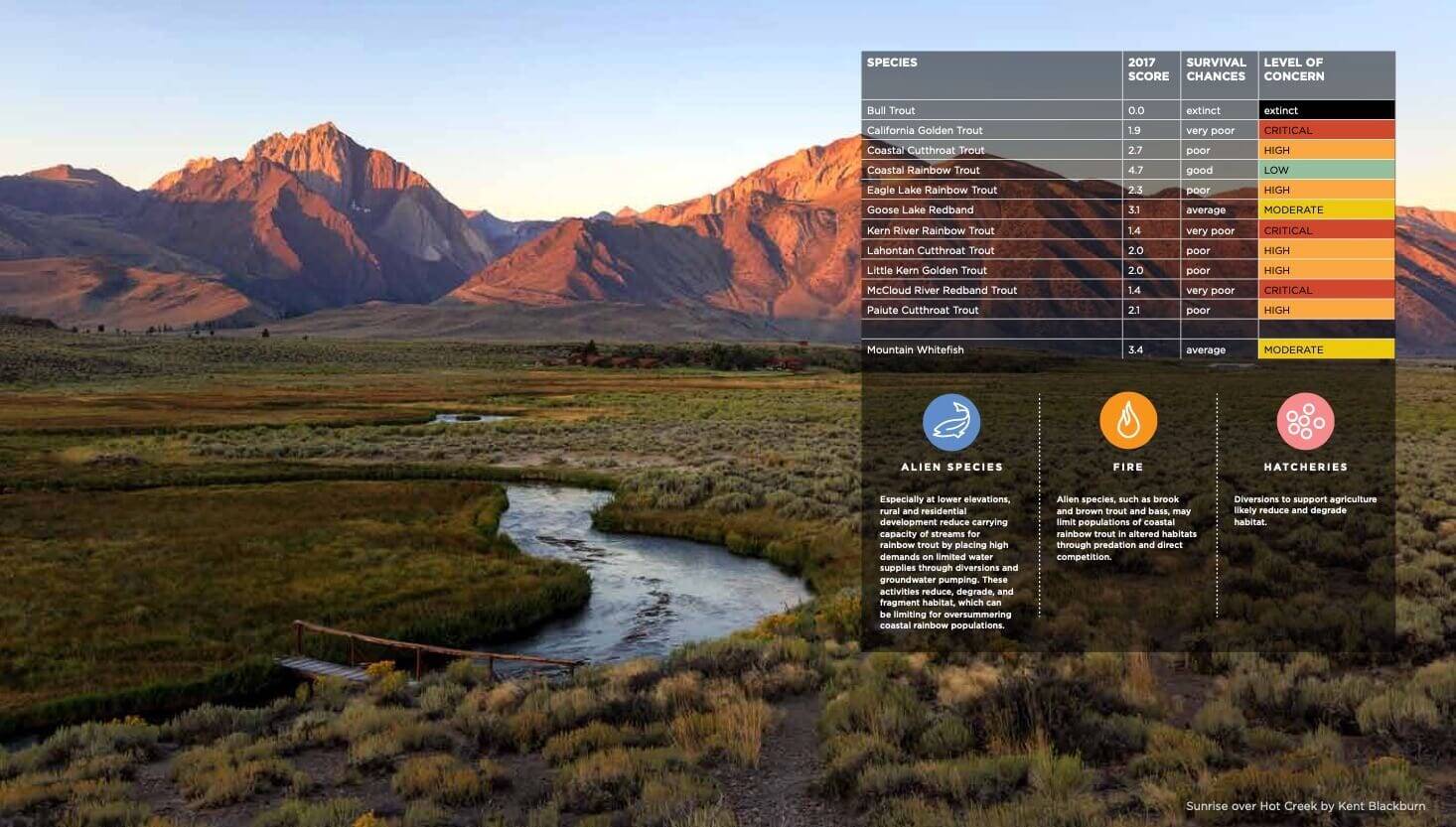 But California’s fishes were not doing well. Reversing the trend would only be possible through science-based solutions. So, in 2007, CalTrout approached me (a long-time CalTrout member) about finding a way to start conserving fish in a more systematic matter. The result was a 2008 report by myself, Josh Israel, and Sara Purdy called Salmon, Steelhead, and Trout in California: Status of an Emblematic Fauna. The report provided a detailed account of the biology and status of the 31 kinds of salmonid in California, with recommendations for actions. A key part of the report was a repeatable method for numerically rating the status of each species: a survival score. CalTrout then produced a dramatic, colorful version of the report intended for a more general (non-scientific) audience. SOS: California’s Native Fish Crisis was widely distributed to policy makers, politicians, and activist anglers, emphasizing the need for action as backed up by solid, peer-reviewed accounts of each species.