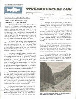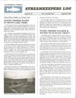 In January 1989, a Sacramento Appellate court judge ordered the state to recall and reissue water licenses to LADWP for the four tributaries to Mono Lake. The new licenses had to comply with DFG Code 5937, which states “The owner of any dam shall allow sufficient water at all times to pass over, around, or through the dam, to keep in good condition any fish that may be planted or exist below the dam.” This ruling, which became known as CalTrout I, ended nearly 50 years of improperly dewatering the streams, and established that the Fish and Game Code 5937 took precedence over LADWP’s water rights.