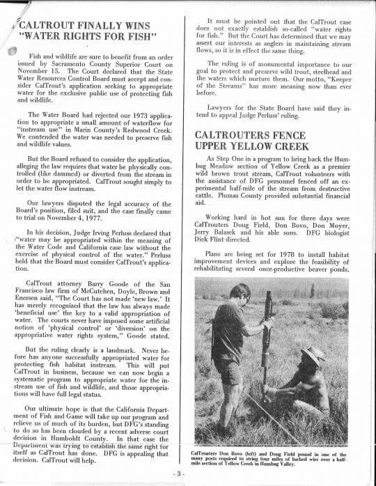 Three days after that, CalTrout petitioned to introduce state legislation to preserve the Eel, Trinity, and Klamath rivers from dams and future development. As CalTrout’s first Streamkeeper’s Log remarked, “That’s action!”