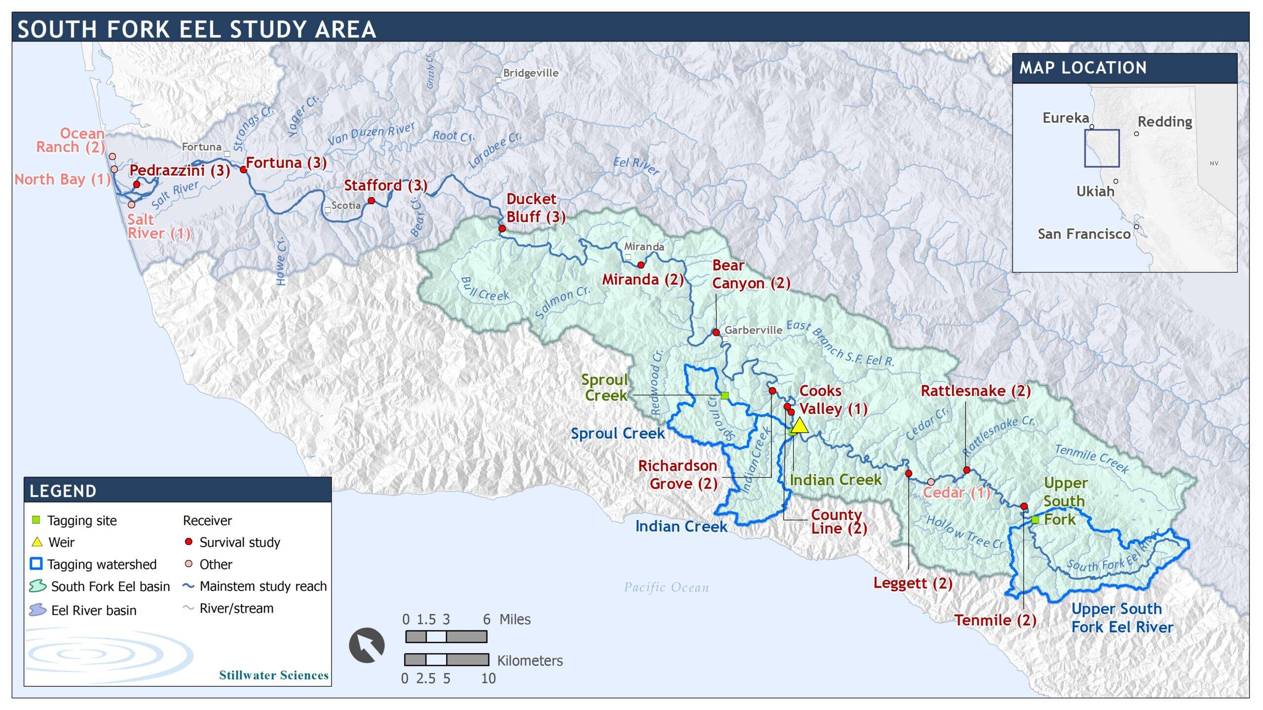 This year, our team tagged over 300 juvenile coho salmon in different streams throughout the Eel River watershed including Indian Creek, Sproul Creek, and the South Fork Eel River. More than half of these fish were adopted! Above, see one of our favorite cuties, Sally the Salmon. These little fish are now on their way to the ocean! Their journeys can range from 40 to 125 miles, and it is a perilous swim with many threats to contend with most notably predation by invasive pikeminnow. The map below shows you locations each fish was tagged, and the path they will follow towards the ocean. Along the way, they will pass by our series of receivers which will give us information about how far each fish has traveled.