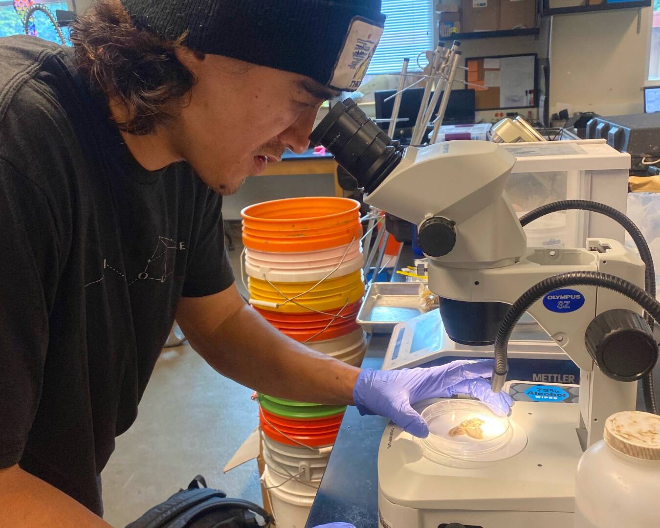 Since Alex spends a lot of time in the field for his position with the Wiyot Tribe, he aids Raven in collecting pikeminnow samples and live fish for the project. In turn, Raven helps Alex out by analyzing some of his samples in the lab. “I think it's been super beneficial for both of us to have another student on the other side of the project,” Alex says.