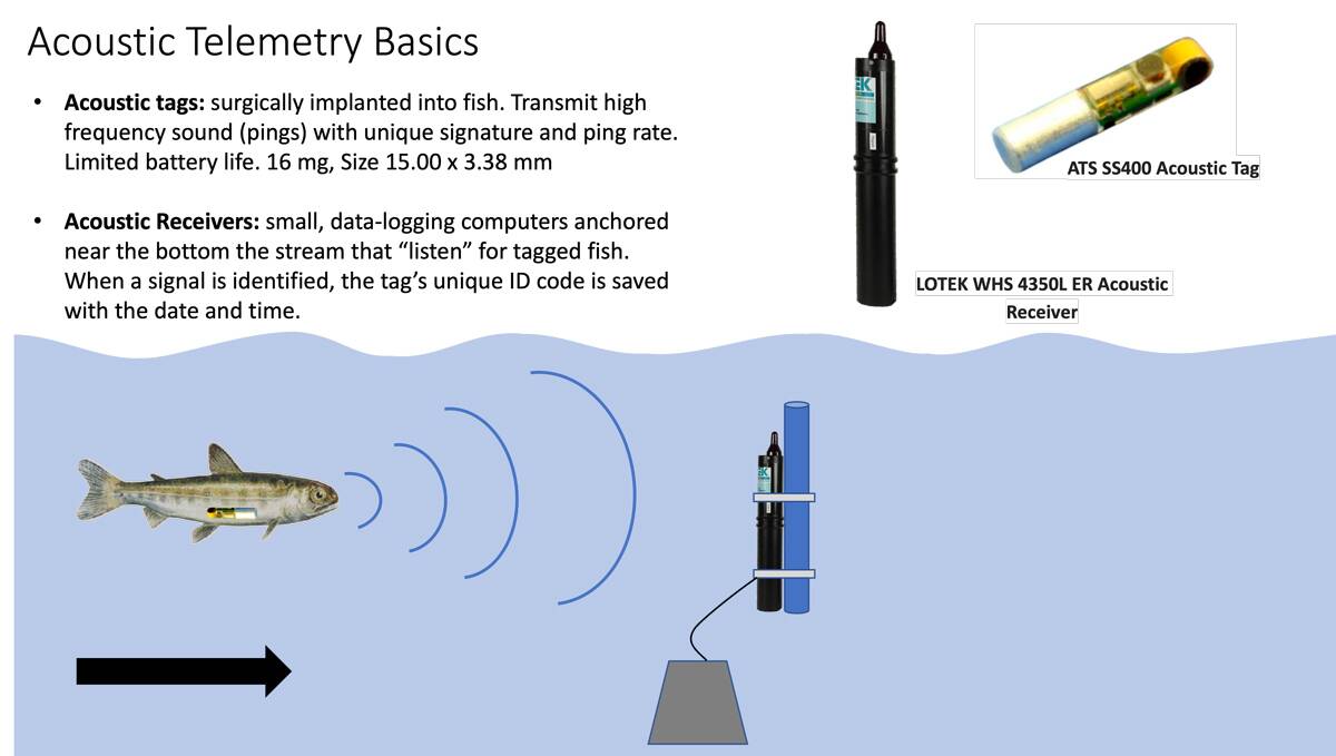Building a picture of how populations of wild fish are moving through and using the watersheds they live in gives us greater context on how to support them to thrive. Many of California’s wild salmon runs face poor odds for survival in the face of the many anthropogenic (human impacts) threats they face. Those impacts are often expressed as poor survival during the freshwater phase of juvenile salmonids’ migration to the ocean. The more accurate information we have, the more accurate, compelling, and spatially explicit suggestions we can make for actions that will protect and restore the watersheds that both our fish and human communities rely on. There are several different methods used to monitor fish populations, but among them are physical monitoring methods like acoustic telemetry tags.