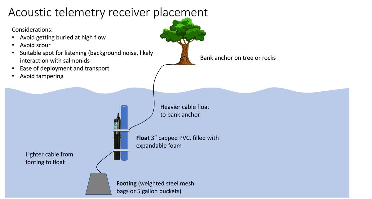 Acoustic receivers are anchored to the bed of the stream and float approximately 3 feet above the bed. Receivers are also anchored to the bank as a redundant measure to protect them from being swept away during high flows.