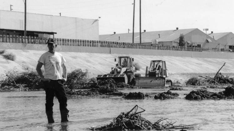 Photo: Lewis MacAdams, founder of Friends of the Los Angeles River, stands in the river as bulldozers clear vegetation from its channel in anticipation of heavy El Nino-driven rains, expected in the winter of 1997-98 | Blake Gumprecht, courtesy of FoLAR.