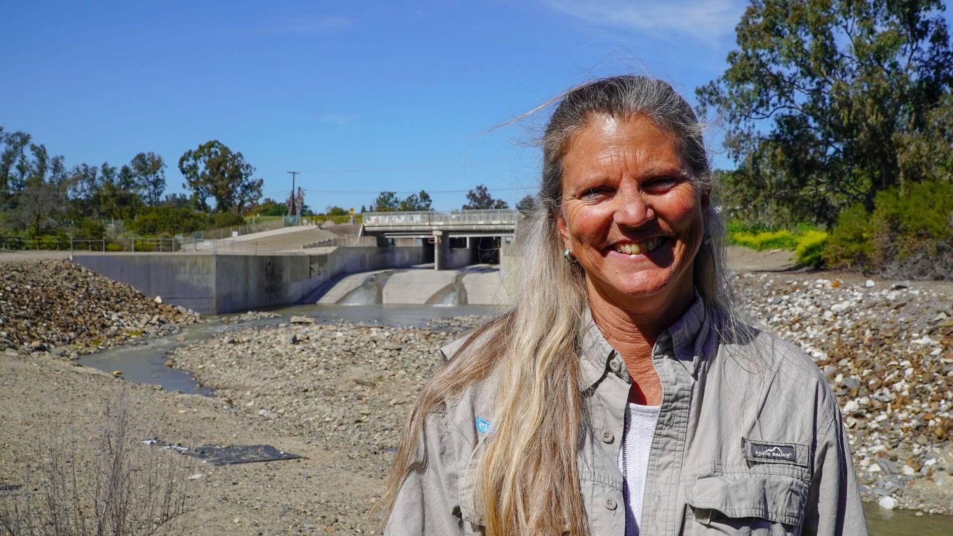 Photo: Sandi standing in front of the I-5 Trabuco Creek Project Site by Mike Wier