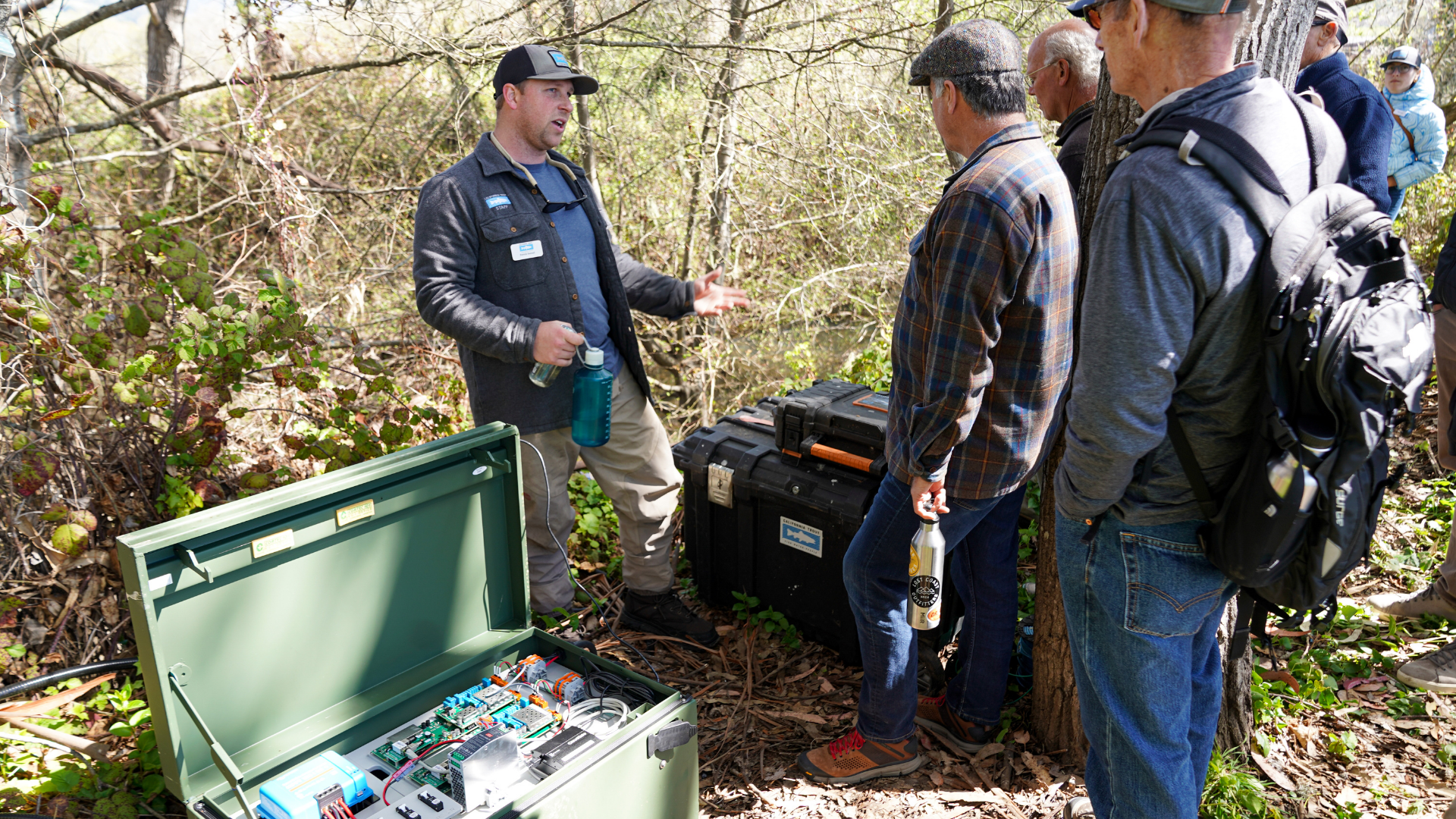 Traveling a few miles east from the marsh, on Pescadero Creek Road, we arrive to warmer weather and far less wind. We are now in the town of Pescadero proper, on the banks of Pescadero Creek with glimpses of its water shrouded by trees and brush. It is a quiet spot except for the rustling of the tree branches — certainly not the kind of place you would expect to find anything out of the ordinary. And yet, as we push down thistles with our shoes, coming within a stone’s throw of the water, a large metal box appears. Patrick Samuel explains this large metal box contains a computer; CalTrout works with partners to use this computer in tracking tagged steelhead and coho salmon passing by an antenna in the creek. The information gathered here is used to complement ongoing fish surveys in the lagoon and upper watershed in order to better understand the population, the fishes' usage of now-connected Butano Creek, and to understand the timing of fish migratory behavior for both juvenile and adult coho salmon and steelhead in the watershed.