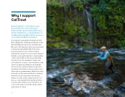 This summer I participated in CalTrout’s Five Rivers Challenge, a shing tournament on the Hat, Pit, McCloud, Upper Sac and Fall rivers. On each of the big rivers, there were moments of profound vulnerability. My footing, the pressure from the rush of water headed downstream, fraction-of-a-second moments of imbalance and swift reminders of my fragility —then a strong sh on the line would bring me into focus—the adrenaline, hands, line, net, a little bit of chaos—and sometimes a sh in the net. And I would think, how fortunate am I to be here at this moment, on this river, standing in the lifeblood of these places and all the places downstream in California. Some molecules of this water destined for Southern California, for the ag lands in the Central Valley, for cities, towns, parks and some for the sea. I am grateful for the CalTrout efforts to assure these waters are protected for all