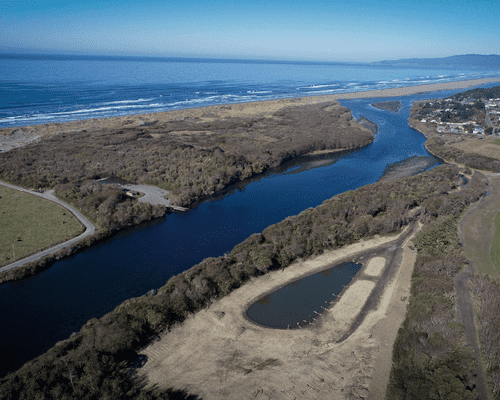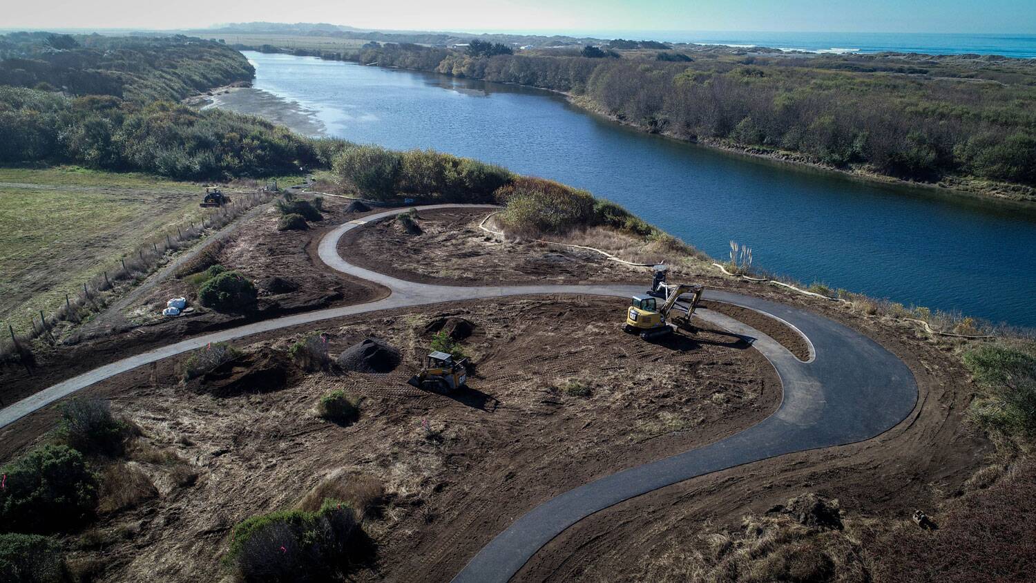 At the close of 2022, the construction of the backwater pond, channel and public access amenities are substantially complete. Three miles from the mouth of the river, the Baduwa’t and tides now carry lightly salty water, fish, and aquatic invertebrates in and out of a newly constructed 1,000 foot channel and a 4-acre complex of riparian wetlands with a large pond. Native plants were planted by California Conservation Corps crews in November and December and are wintering, waiting for a warm day in the spring to spread out new leaves.