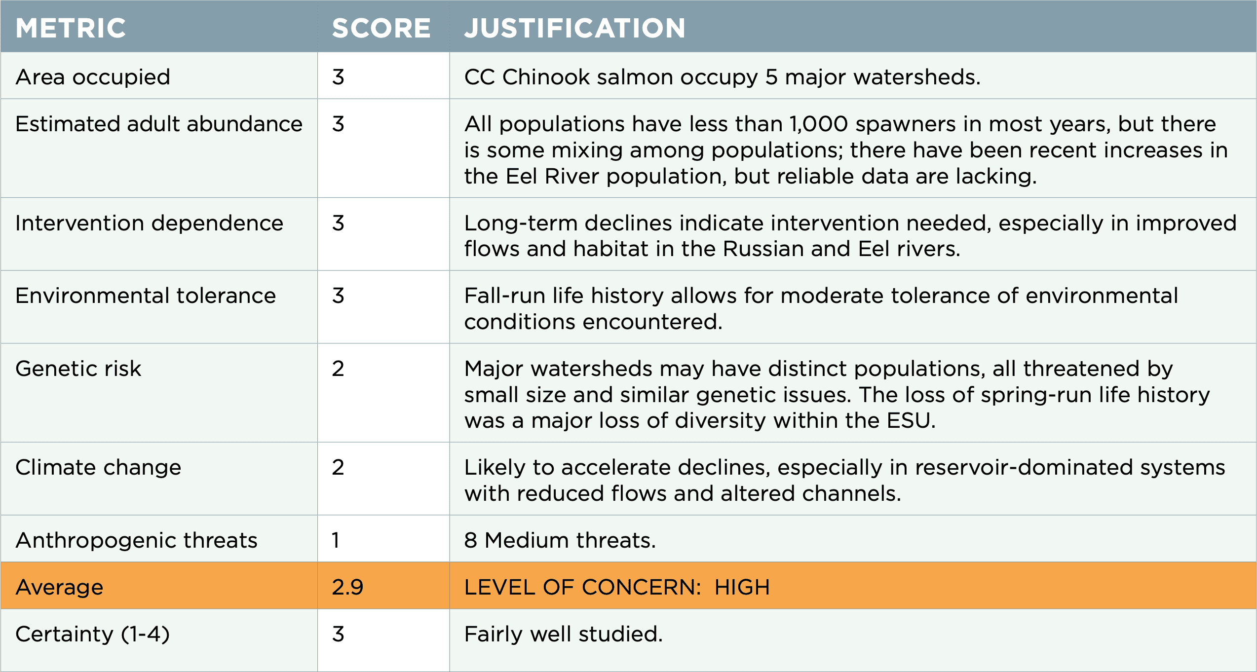 CC Chinook Salmon in the Eel River are more closely related to populations in norther watershads than to those found along the Mendocino Coast. Chinook Salmon of unknown origin occasionally migrate to coastal basins south of the Russian River (e.g. Lagunitas Creel, Marin County), and are under consideration to be included in the CC Chinook Salmon ESU in the future, based on their reported genetic similarities.