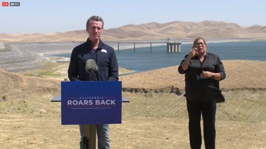 Standing on dry land that would in a normal year be covered by the waters of the San Luis Reservoir, California Gov. Gavin Newsom extended his drought declaration to most counties on May 10, 2021. (Image from courthousenews.com)