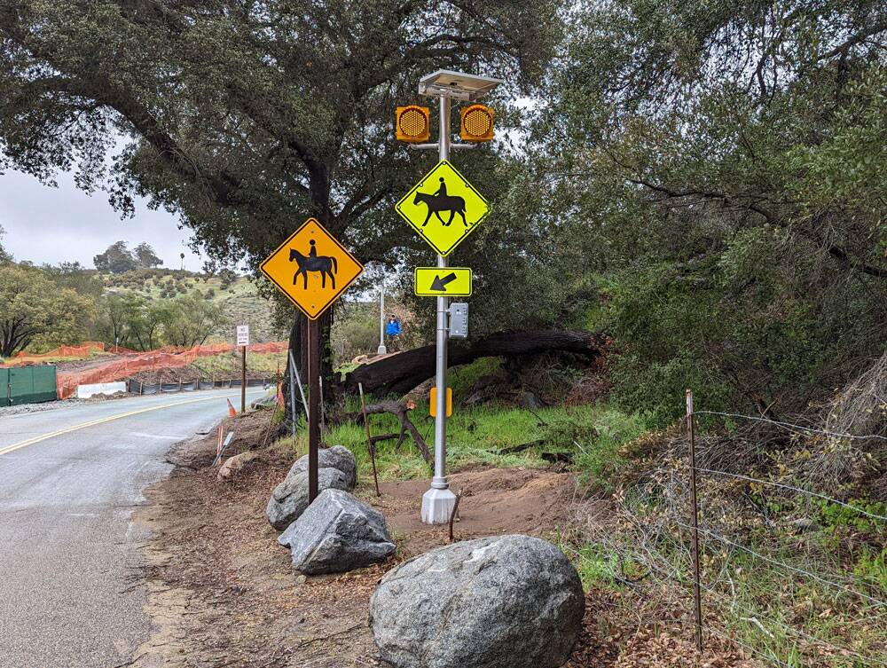 The Santa Margarita River-Sandia Creek Drive Bridge Replacement Project will eliminate the last remaining barrier to migrating anadromous fish, restore the natural hydrology of the river, and provide safer vehicle access across the river during large winter storms. During construction it is our priority to provide safe passage for trail users. To assist with public safety, new crossing lights for the connector trail system have been installed (below left panel), and the California Conservation Corps (CCC) constructed a by-pass trail (below right panel) to be used while the new bridge crossing the Santa Margarita River is being built.