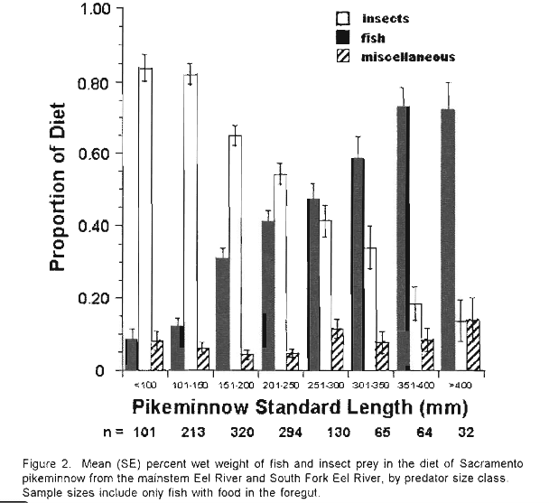 [Graph from:Nakamoto, R. J. and B. C. Harvey. 2003. Spatial, seasonal, and size-dependent variation in the diet of Sacramento pikeminnow in the Eel River, northwestern California. California Fish and Game 89(1): 30-45]