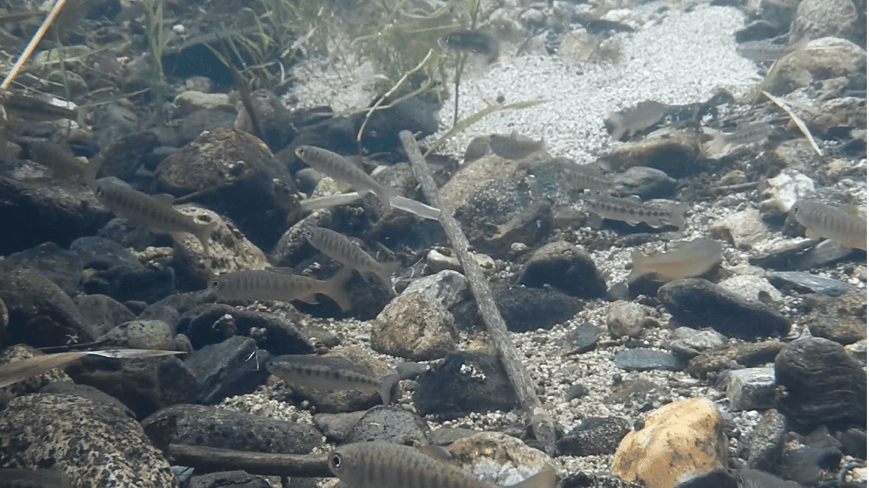 Juvenile coho salmon and rainbow trout rearing in pool habitat on Lower French Creek in July 2019. Used by permission of Chris Voigt, Siskiyou Resource Conservation District.