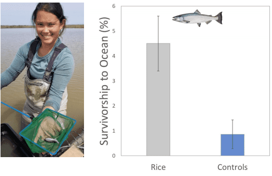 We recruited a graduate student (Rachelle Tallman, pictured) who in year 1 of work successfully reared Chinook salmon in cages at Conaway Ranch near Woodland CA, and in lab tanks at UC Davis. Upon reaching taggable size, she conducted surgeries on these fish to install miniature acoustic transmitters to track survival of these fish to the Golden Gate Bridge. In year 2, we conducted a similar project using experimental rice plots at River Garden Farms and provisional data that were highly encouraging. Results suggested that rice-reared fish had substantially better survival rates than lab-reared fish (see bar graph). This study provides some of the first evidence that rice-rearing of Chinook salmon has the potential to positively shape population dynamics of salmon in California. We have also produced science that is being used by the California Rice Commission to draft a USDA NRCS “practice standard”. The goal of the practice standard is to incentivize California rice growers to participate in salmon conservation activities by tweaking their winter field practices and infrastructure to be fish friendly. A postdoctoral fellow funded partly by the Endowed Chair (Dr. Parsa Saffarinia) is synthesizing available data to estimate the acreage of wetlands needed in the program to change the salmon population in the Sacramento River from a declining to a growing one.