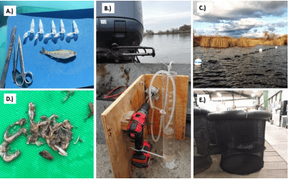 A.) Fish sampling setup with eppendorf tubes for tissue storage; B.) Portable water sampling with three stage filtration; C.) Deployed exposure cages at our Delta site; D.) Gut contents from fish with copious amounts of copepods; E.) Exposure cages.