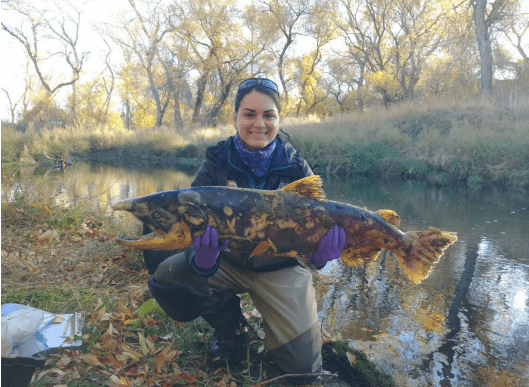 Postdoctoral scholar Annelise Del Rio with an adult Chinook salmon carcass recovered from Putah Creek in Fall 2020. Photo by Leah Mellinger