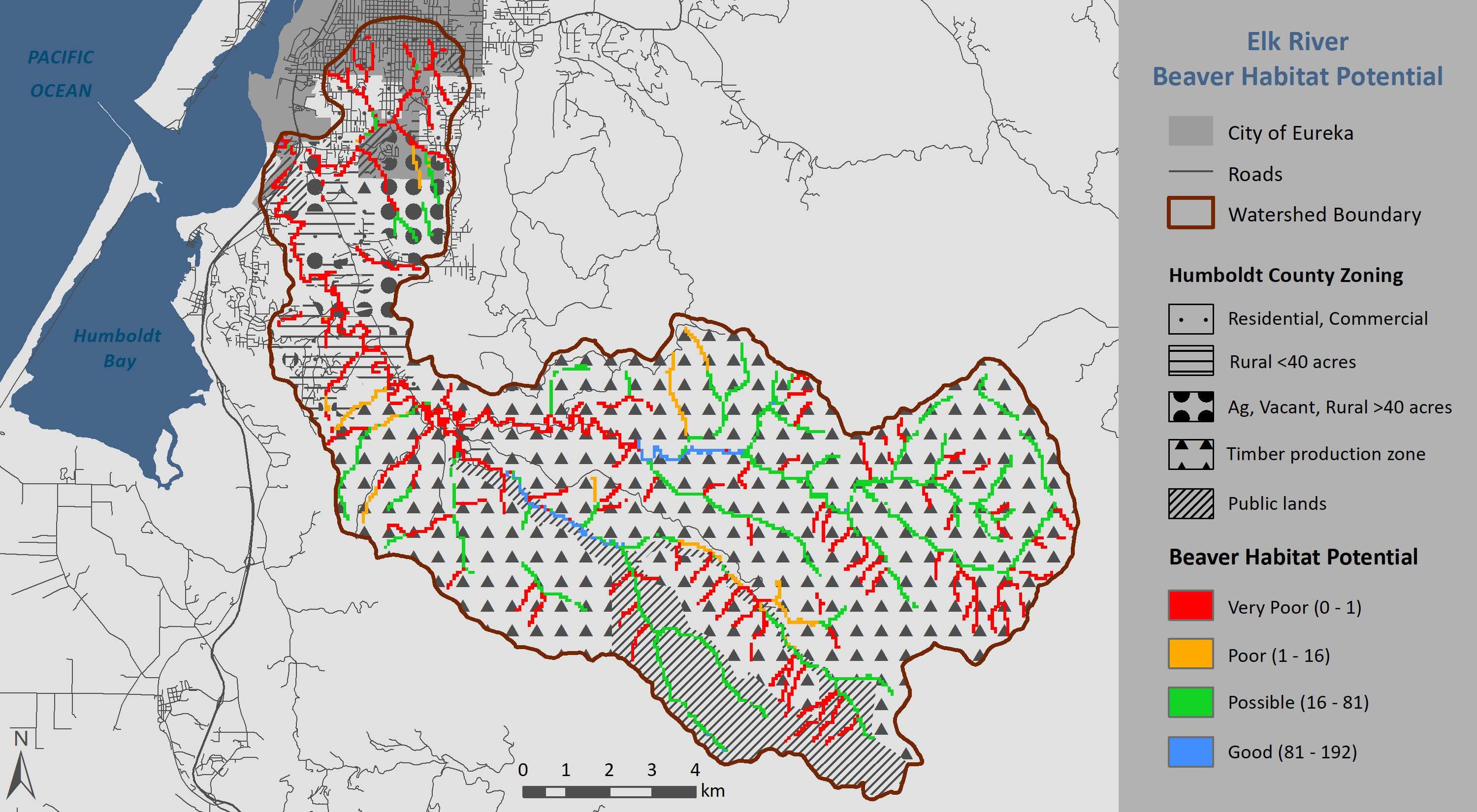 I used my final projects to deepen my understanding of hydrology and North Coast rivers, so I’ve mapped sea level rise on Humboldt Bay, conducted a longitudinal analysis of the vegetation changes on Cannibal Island, and constructed maps of intrinsic potential for salmon on Cedar Creek. As I write this, I am working on an analysis of beaver habitat on the Elk River, as well as an atlas of the Elk River watershed in various map styles, including a faux blueprint.