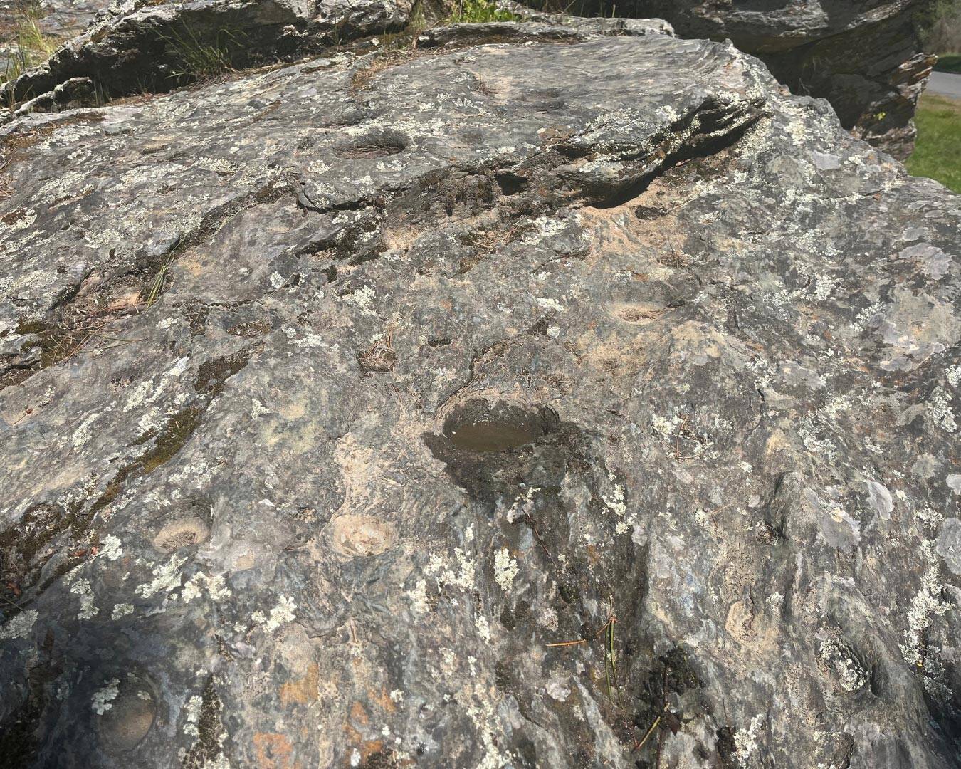 The creek flows year-round and is a stronghold for endangered Central California Coast coho salmon and threatened steelhead. Spawning runs of these fish were a major food source for the Coast Miwok people whose presence remains evident across the landscape. Our first stop on our tour today is to view grinding pits in rock outcrops that Coast Miwok peoples used to make acorn meal which they might eat with fish and other foods. We reflect on how the landscape has changed as we walk from the grinding pits to the creek.