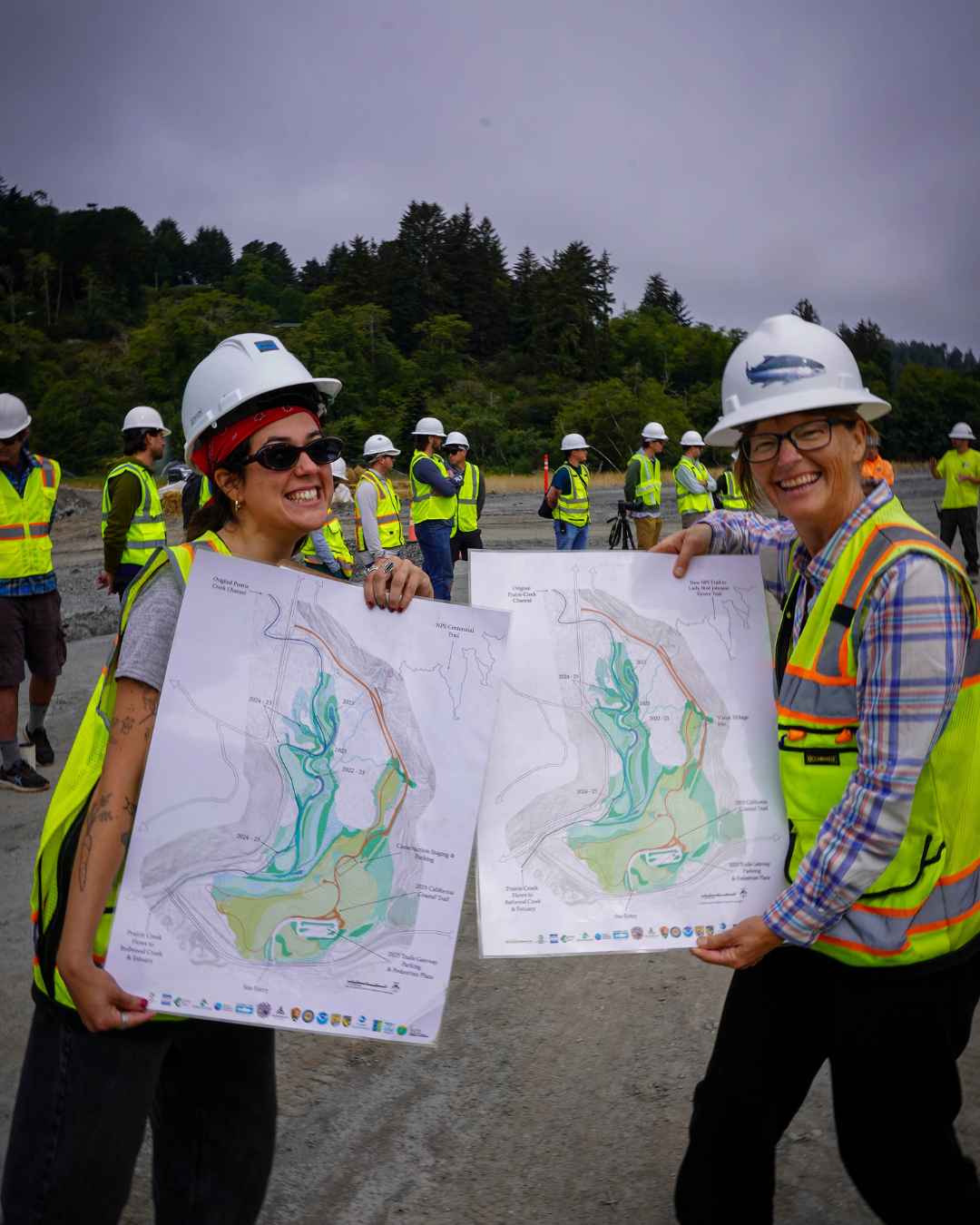 Wednesday was the start of our big site visit – ‘O Rew at Prairie Creek! We took the 90-minute drive, through the redwoods, to the site of an extraordinary project led by CalTrout staff, Mary Burke and Ashley Shannon, the Yurok Tribe, Save the Redwoods League, funding agencies, and a team of local partners. It was immediately clear the care they put into this project, working diligently to make sure this project happens in a timely and respectful fashion. We met with members of the Yurok Tribe, whose Construction Corporation is leading the on-the-ground construction. The guided tour included touchpoints on how the creek is being rerouted, a space affectionately known as the “vampire graveyard,” the native wildlife benefitting including coho salmon and elk, and a description of how the landscape will look at the end of the project. Seeing CalTrout’s mission in action was the coolest thing to see on my third day on the job.