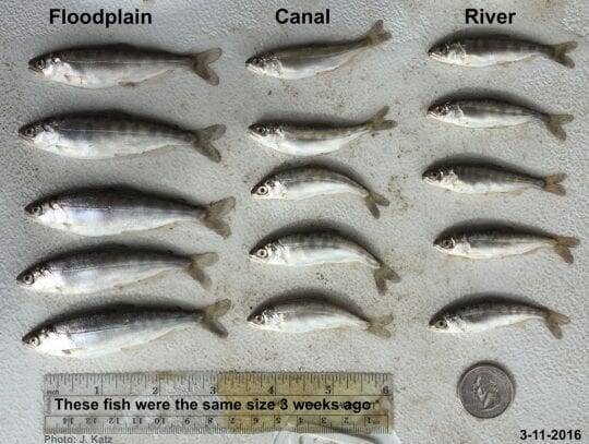These fish were the same size 3 weeks ago. You can tell that the fish on the floodplain are bigger because of food availability. Photo: Jacob Katz