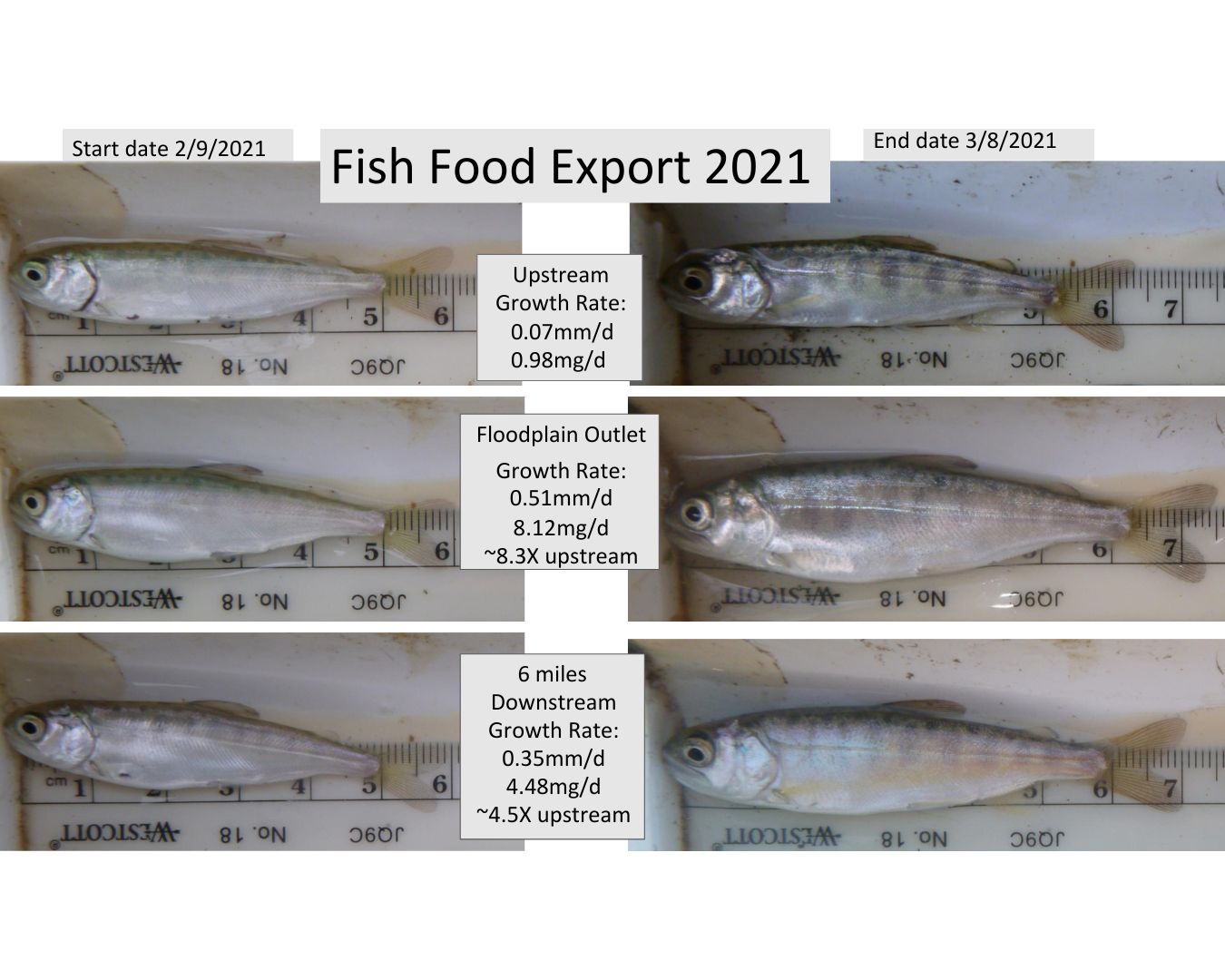 Our monitoring data from the last several seasons clearly demonstrates that fish grow as fast during subsequent drainage cycles as they had in the first. And, because we were paying per flood and drain cycle, we found most landowners were willing to flood and drain multiple times. In 2021 we enrolled 8,775 acres in the program and 2,164 of them completed two cycles. In addition to increasing the overall volume of fish food delivered to the river, enacting multiple cycles also spread out the food benefits over time - meaning more fish could access it throughout their outmigration season. With that, we were off to the races and have been building the program year by year.