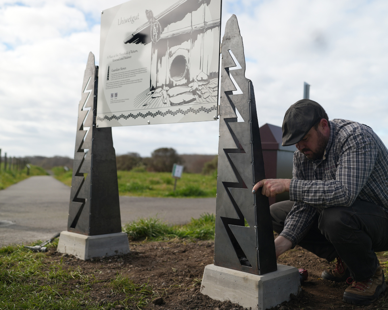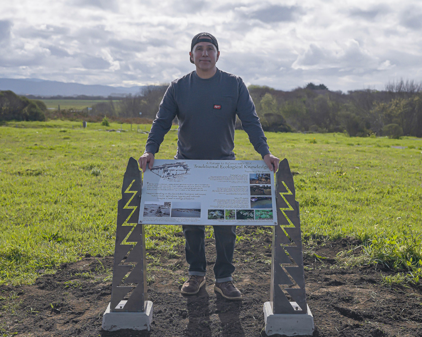 The signage was installed on Monday, February 12, 2024 at the western end of School Road in McKinleyville. The new installation includes three interpretive signs with artwork by Alme Allen and Jullia Finkelstein. Over the past eight years, the sign’s narrative was cultivated with the Wiyot Tribe, CalTrout’s project manager Mary Burke, and Denise Newman with RCAA – whose designs artfully thread interpretive themes together. These signs welcome and orient visitors to the site and are held proudly between original pedestals designed by Alme Allen and fabricated by Nick Kieselhorst of Ironside Metal in Arcata to create a powerful sense of place.