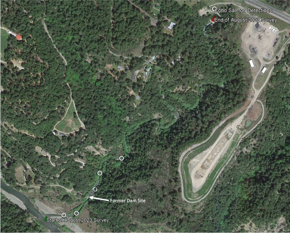In August 2023, CalTrout staff conducted a snorkel survey of Cedar Creek from its confluence with the South Fork Eel River, through the former dam site, and up to the Highway 101 crossing. During this survey, 34 juvenile coho salmon were observed, many of which were upstream of the former dam site. Juvenile steelhead and resident rainbow trout were also observed throughout the survey, both below and above the former dam site.