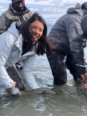 Despite the cold water and the size of this tiny fish, this catch was both a relief and celebration for me and everyone on the trip. We could finally celebrate the fact that all 25 women on the trip caught a fish!