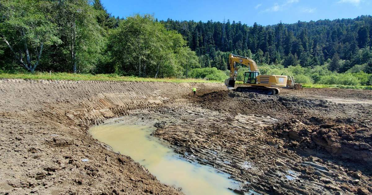 In 2022, the Prairie Creek Floodplain Restoration Project began a two year phase to restore 11 acres of riparian habitat, create 800 feet of a new creek channel, and construct a second backwater pond to provide slow water refugia for juvenile salmon and steelhead. Today, the creek is constrained against the asphalt of Highway 101. This work will move the creek allowing it to meander and connect to a restored floodplain with a richness of native plants as the basis for the nutrient-rich food web.