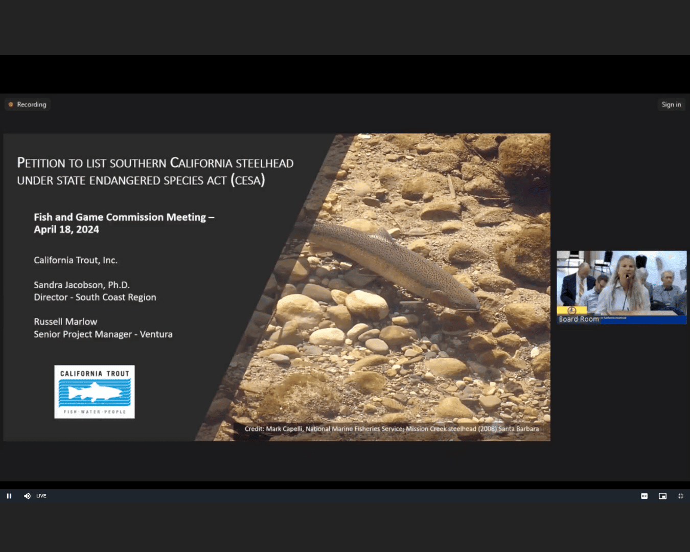 CalTrout applauds the Fish and Game Commission for underscoring the urgency of the situation with this vote today, and we thank the California Department of Fish and Wildlife for their comprehensive species status review as part of the CESA process and their long-standing support for Southern steelhead recovery. CalTrout has been actively advocating for this listing since 2021, when we submitted a petition to the California Fish and Game Commission to fully protect Southern steelhead as endangered under the state’s Endangered Species Act. The action today would not have been possible without the tireless efforts and advocacy of our many partners in Southern California working to save this species.