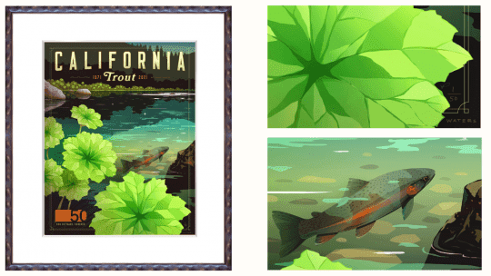 Renowned local artist and angler Paul Waters has created this masterpiece of a fabled Northern California trout stream representing the past, present, and future of California Trout. In the foreground, the umbrella plant represents the first five decades of California Trout’s history, with the sixth and smallest leaf looking toward the future in anticipation of CalTrout’s continued conservation work. Each of these posters is signed and numbered by the artist. This is your chance to own a beautiful piece of CalTrout history, knowing you are a part of its future.