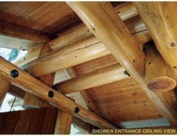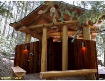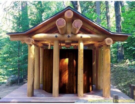Eight log columns support log entablatures and pediments which were painstakingly scoured and fit together with hidden structural hardware. The trees that were used for the construction were scheduled to be removed to complywith CalFire requirements. Bark was stripped onsite in the winter when the sap was frozen and the logs were placed on sleepers to dry for a year. Flat basalt stones at the entrance were sourced during the road construction. Large andesite viewing rocks that were pitched out of an eruption of Mt. Shasta over two centuries ago, are followed by the entrance path and worked into the deck design. In the center of six of the columns is an open cedar cask, which houses an accessible toilet and sink entered by a curved door at its axial entrance. Beyond the cask and between its columns on the western entrance is the shower, which flows from the kingpost between the two columns. Here the deck rotates at a 45-degree angle and has two privacy walls which block views to the shower, while creating an open view of the forest for the showered. Two cut logs provide seating and alert of a grade change at the open end of the shower area. The TroutHouse is fed by onsite spring water and illuminated by indirect LED lighting.