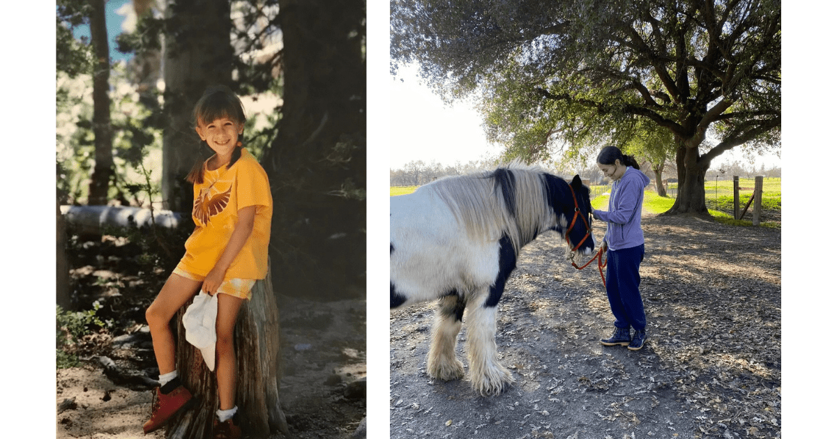 Left: Analise as a child, enjoying nature. Right: Analise with her mom's horse, Charlie.