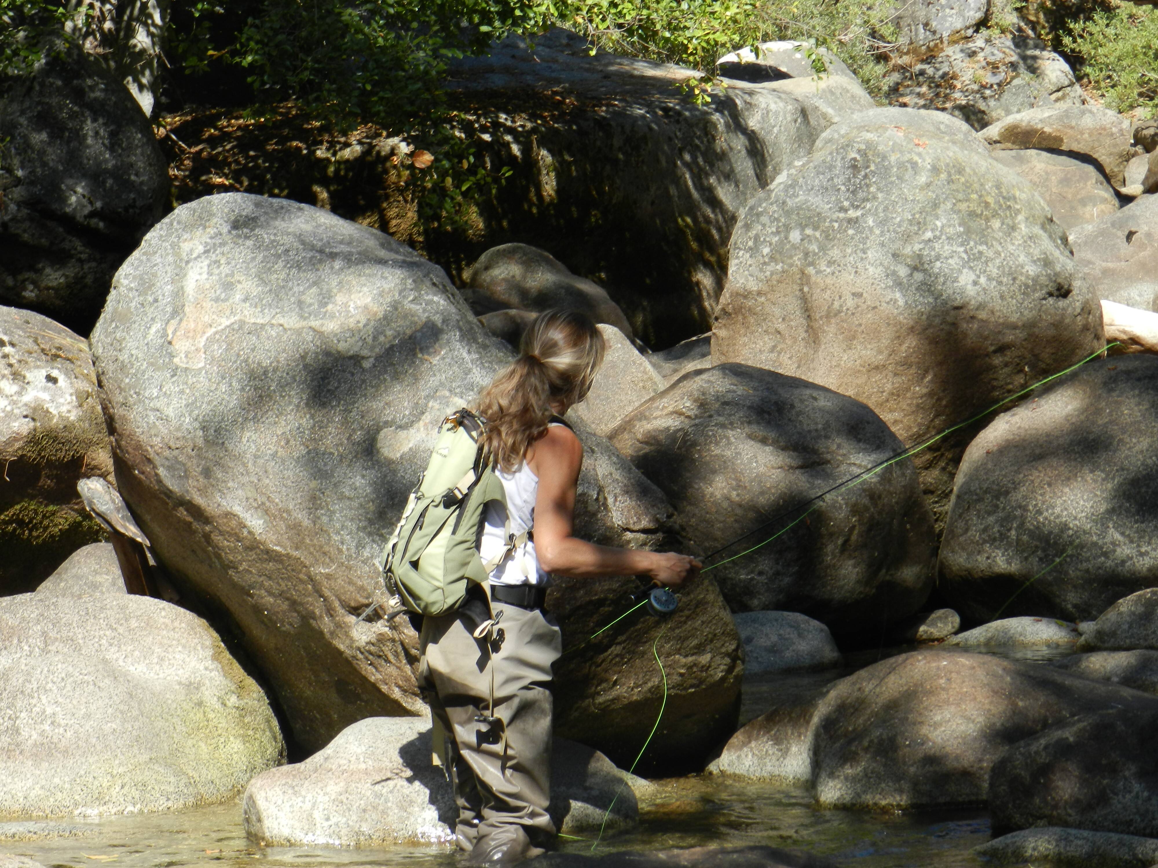 SJ: There are many, big rivers and small streams. During my time spent in the Central Valley, I lived close to Sequoia National Park. On weekends, my husband and I would go up to the Kaweah River. The Marble Fork of the Kaweah is just beautiful fly fishing. These are small streams, and you just take this little three-weight rod with you; climb over these huge boulders and its exhausting, but then you drop into pools—need to be super quiet while moving and casting. Except for some bears, there would be nobody else out there — the whole river to yourself. Sadly, that area burned severely in a recent fire. I know it will grow back and it will be healthier than before, but that was really hard to watch knowing that it was going up in flames.