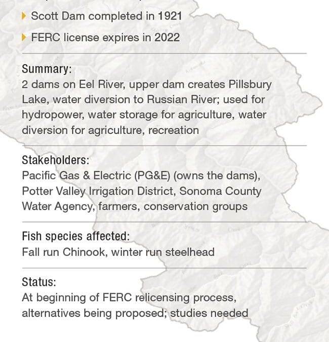 PG&E’s Potter Valley Project, located near the Eel’s headwaters, produces a trickle of hydroelectricity and diverts Eel River water into Potter Valley in Mendocino County and Sonoma County’s Russian River. In the Russian, it supplements flows and provides irrigation water to wine producers in the Alexander Valley and for use by ranchers, farmers, and Sonoma County residents. The project includes two dams, a hydroelectric facility, and a diversion tunnel. It has also completely blocked more than 150 miles of fish habitat since 1908. But that could change.