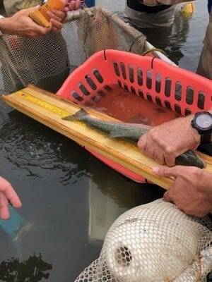 Team fishes out fish caught in the seine net and prepare them to be measured and tag. Photo: Paul Vais