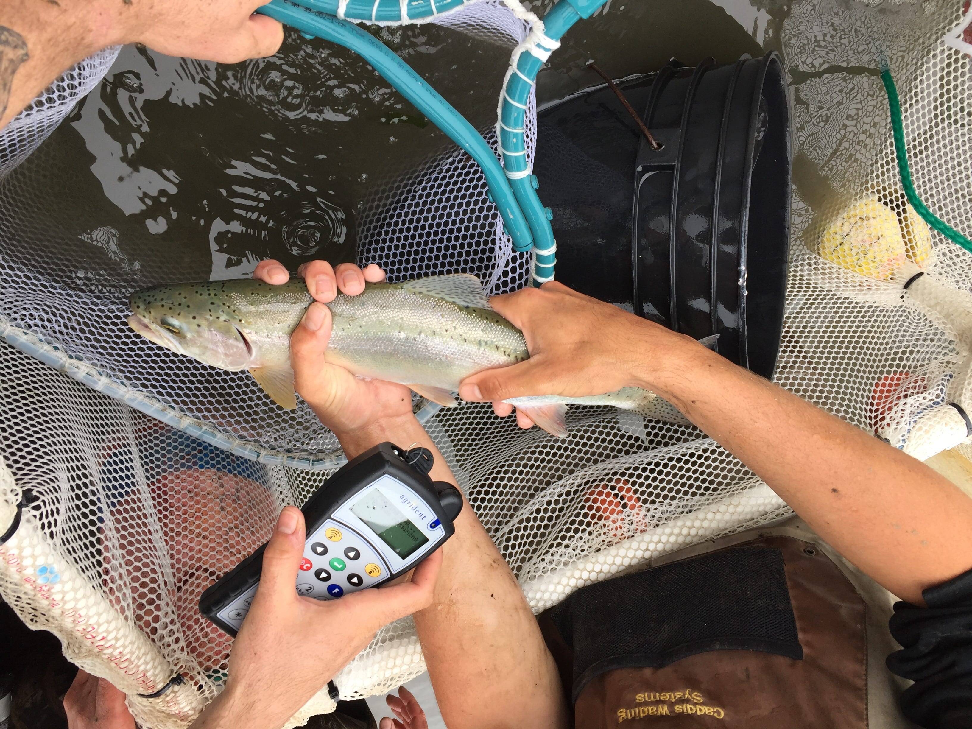 Team using a PIT tag reader to identify the fish. Photo: Paul Vais