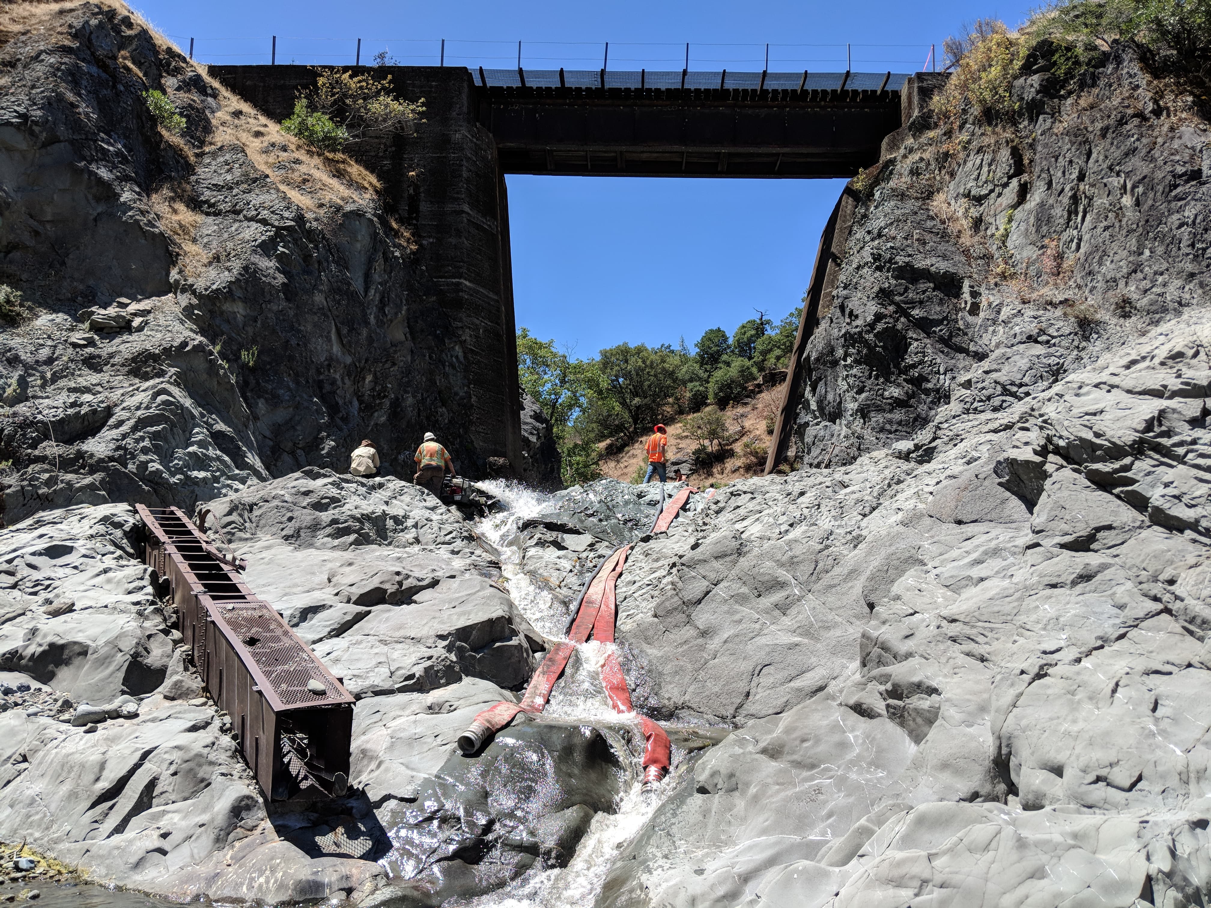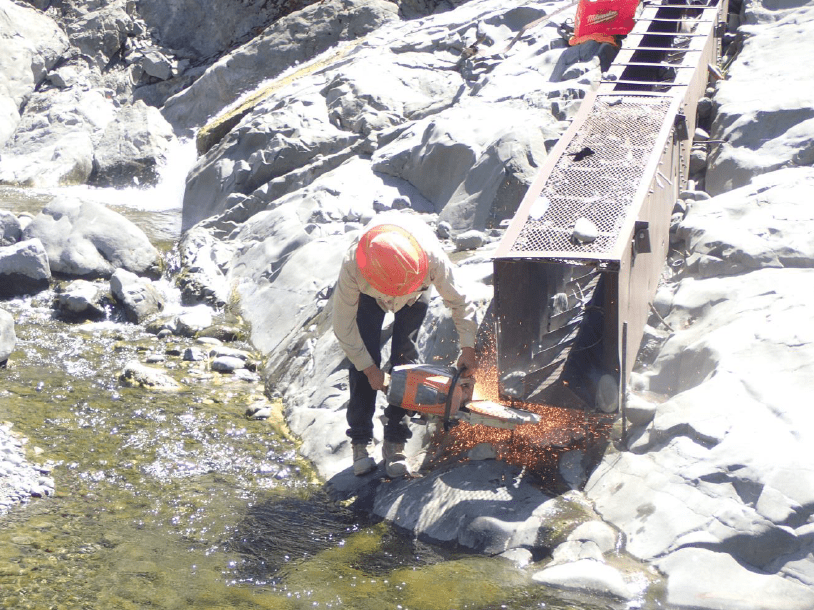 The non-functional fish ladder rebar was cut off the bedrock at the fish barrier.