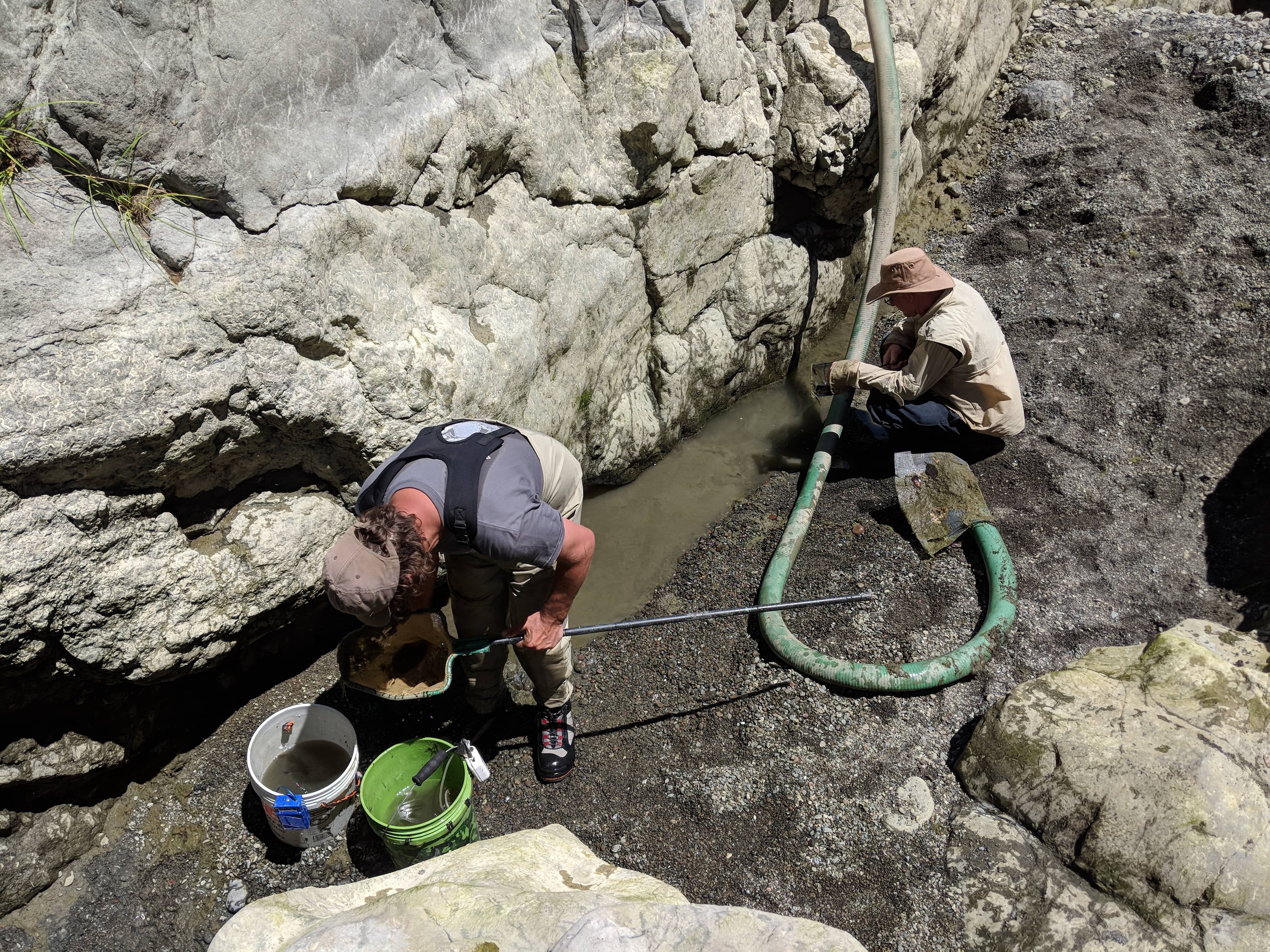 The crew must relocate species in the area using electrofishing. This method temporarily immobilizes them allowing the crew to safely move species without harming them.