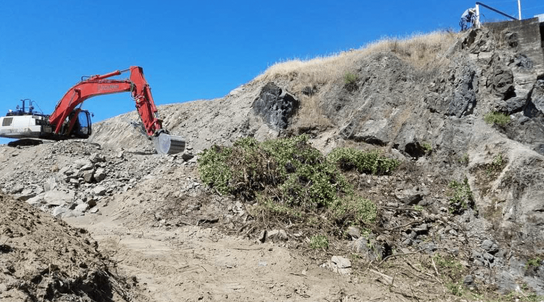 Excavators were busy stockpiling rock for the channel plug and excavating railroad embankment material.