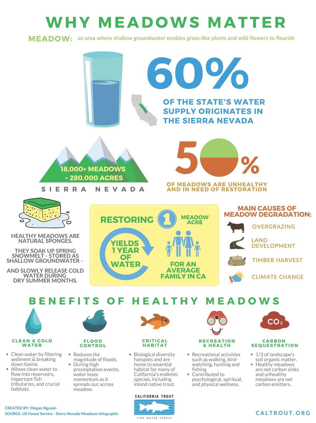 60% of California's water originates in the Sierra Nevada mountains. Sierra meadows cover less than 2% of the overall sierra-Cascade landscape, but they are biological hotspots that sustain the headwaters of several major California water sources.