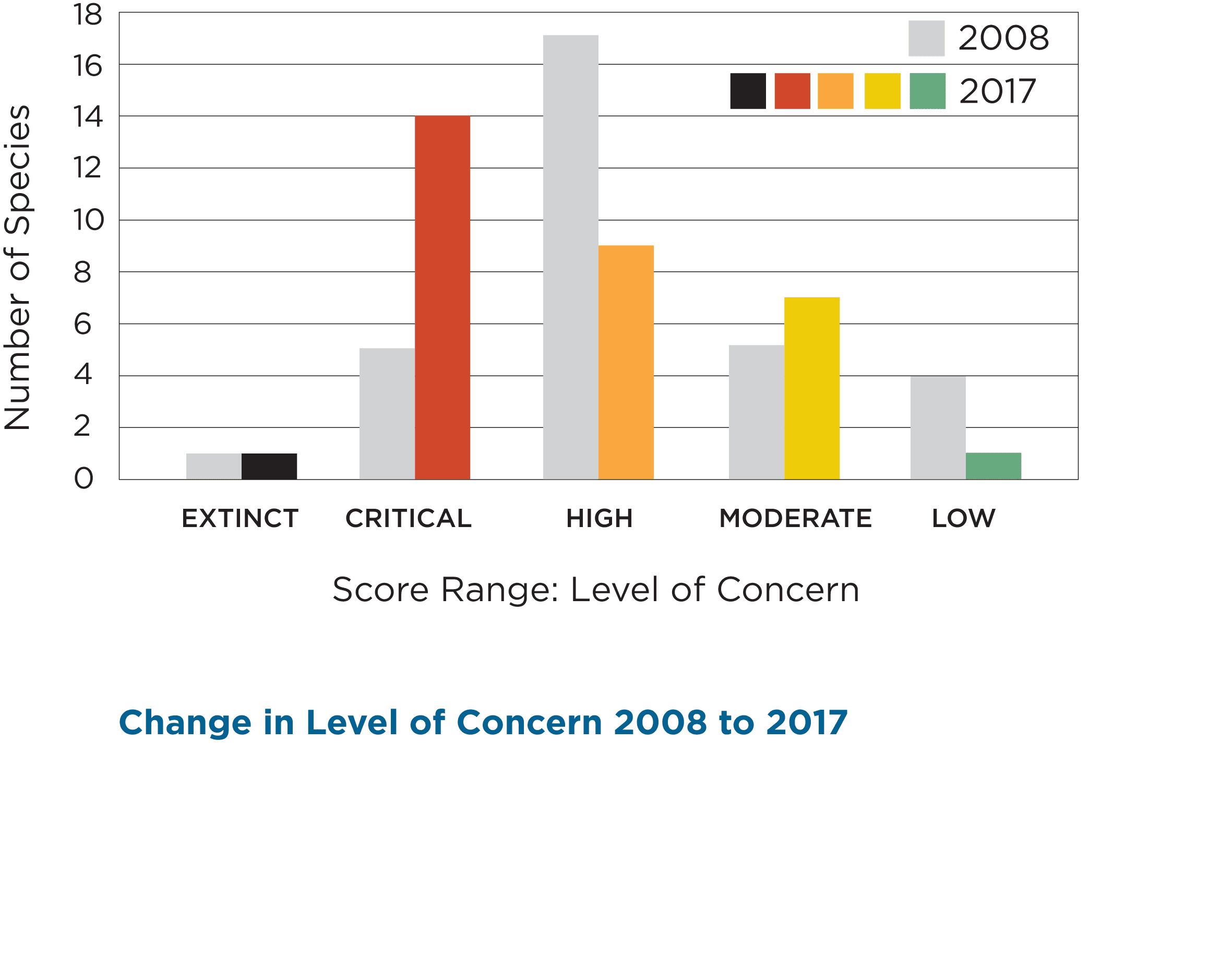 For most species, abundance generally declined due to reductions in suitable habitat stemming from drought impacts. An improved understanding of genetics, abundance, and species range information has also positively or negatively impacted species status. For example, the Level of Concern for Central Valley steelhead remained the same (Moderate) since 2008 due to a better understanding of the nature of steelhead/resident Rainbow trout interactions and genetics, despite recent low adult returns. Conversely, the Central Valley fall-run Chinook salmon Level of Concern increased significantly (from Low to High) since 2008 due to a better understanding of the limited abundance of wild individuals without signs of hybridization with hatchery fish.