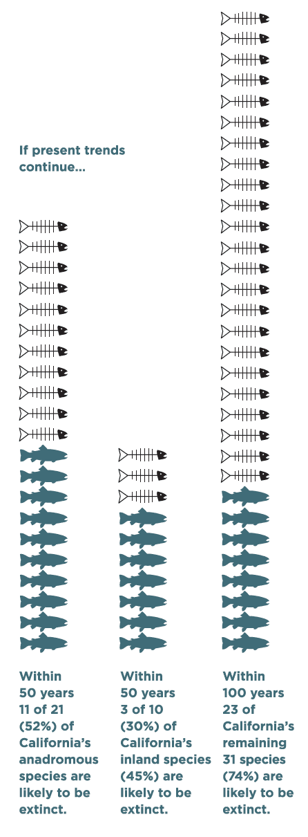 The science-based report is clear - if we don't act, we risk losing our native fish species.At the current rate, 45% of California salmonids are likely to be extinct in the next 50 years. This includes 11 of 21 anadromous species (52%) and 3 of 10 inland species (30%). In 100 years, 23 of the remaining 31 species (74%) are likely to be extinct if present conditions continue.