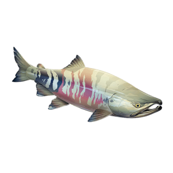Chum salmon are one of the smaller species of salmon; they may grow to over 1 m in length, but most in California are less than 65 cm (26 in.). They are best known for their slight hump, hooked snout, and protruding canine-like teeth during spawning. They are dark olive on the back and dark maroon on the sides, with irregular greenish vertical bars on the sides and no spots on the back or tail.