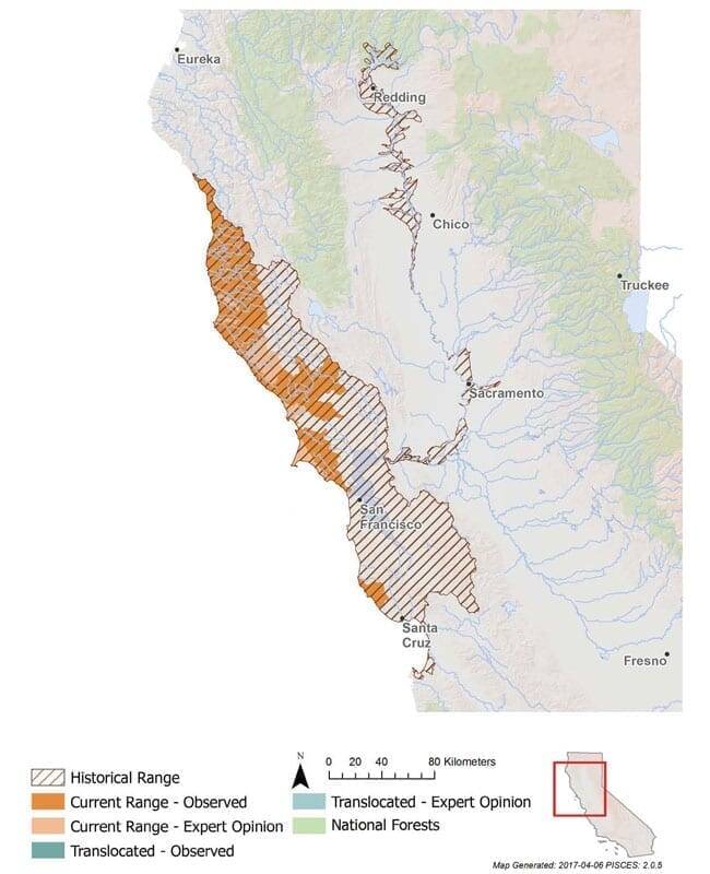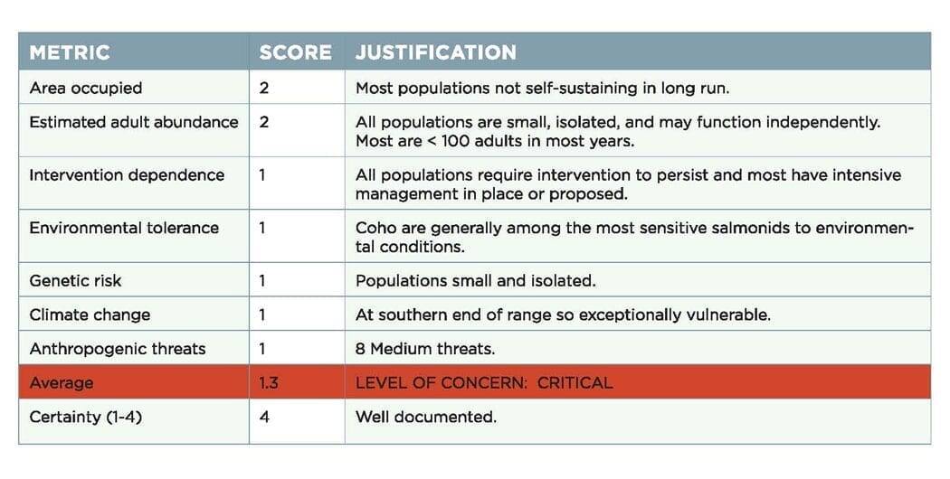 Almost all of the remaining streams containing CCC Coho salmon have populations less than 100 spawning adults per year, unless enhanced through hatcheries. Most CCC Coho populations are threatened with extinction in the near future, with the exception of populations in Lagunitas Creek (Marin County), the Russian River (Sonoma County), and Santa Cruz County watersheds due largely to the heroic efforts of managers, concerned citizens, and conservation hatcheries.