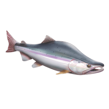Pink salmon have large black oval marks and spots on their backs, tails, and fins making them easy to tell apart from other salmon species. In the ocean, their backs are silvery blue to olive in color, with silver sides and white bellies. In freshwater, males take on a humped back, while their snouts, full of sharp teeth, become exaggerated and hooked. Pinksalmon are the smallest members of the salmon family, usually reaching 60 cm long (about 24 in.) and weighing 2.5 kg (5.5 lbs.). The largest recorded Pink salmon measured 76 cm (30 in.) and weighed 6.3 kg (nearly 14 lbs.). Unlike other juvenile salmon, Pink salmon do not have parr marks.