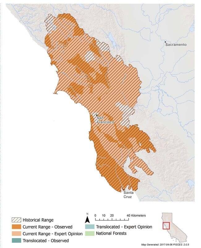 Historical abundance estimates of Central California Coast steelhead are limited. During the early 1960s, the California Department of Fish and Wildlife estimated about 94,000 CCC steelhead spawned throughout their range, with most spawning occurring in the Russian (50,000) and San Lorenzo rivers (19,000). With the exception of hatchery-raised steelhead from the Warm Springs Hatchery on the Russian River, most watersheds support less than a few hundred adult steelhead per year. Current populations are likely less than 10% of these historical estimates. For example, CDFW has not documented spawning steelhead in San Francisco Bay tributaries since the drought started in 2012.