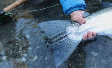 All CCC steelhead are winter-run fish, entering freshwater as mature adults during the highest flows of the year, typically between late December and February. Adults returning to freshwater are mostly three and four years old, and typically spawn during late spring (February to April). With favorable flow and temperature conditions, female steelhead may spawn and return to saltwater in only a few weeks, while male fish may linger and spawn multiple times before returning to the ocean. Eggs hatch after about a month in the gravel, with fry emerging and beginning to feed about three weeks later. When juvenile steelhead reach about 10 cm (about 4 in.) in length, they begin to smolt and migrate downstream during spring and summer months to seek out foraging opportunities in larger mainstem rivers or critical estuaries and lagoons. Smolts spend up to two years or more in larger rivers and estuaries putting on weight and roughly doubling in length before their arduous journey to the Pacific Ocean. Once at sea, CCC steelhead migrate to cool waters offshore of the Klamath-Trinidad coastline before moving to feeding grounds in the North Pacific with steelhead from other regions.