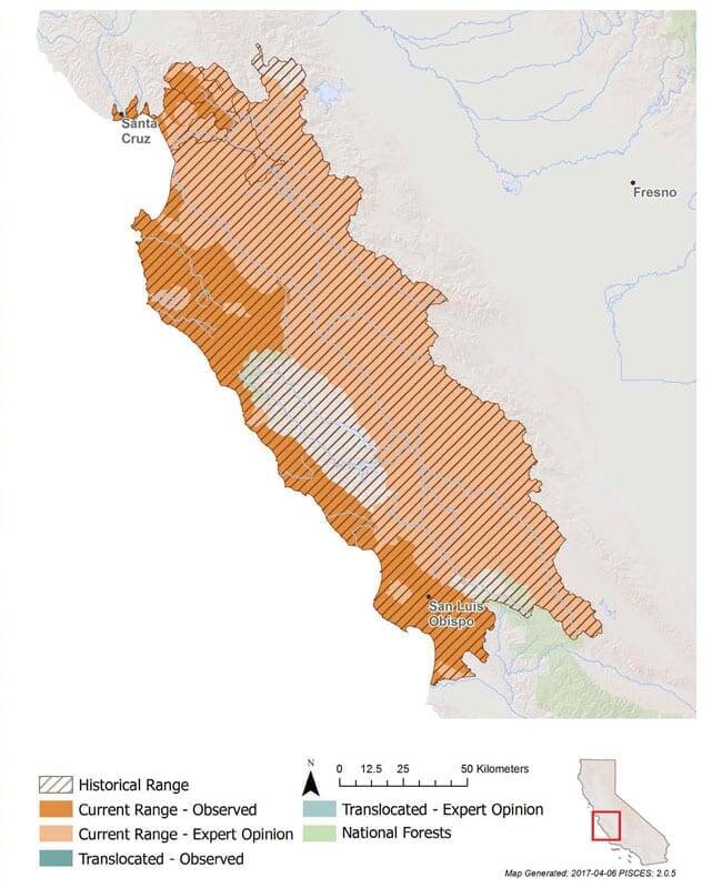 SCCC steelhead range from the Pajaro River (Santa Clara/San Benito Counties) southward to the southern edge of San luis Obispo County. The watersheds that historically supported the largest populations of SCCC steelhead include the Pajaro, Salinas, Carmel, and Big Sur rivers. Prior to the 2012-2016 drought, SCCC steelhead were still found in nearly all coastal watersheds in their historical range, including streams with no recent historical records of steelhead, such as los Osos, Vincente, and Villa creeks (San luis Obispo County).