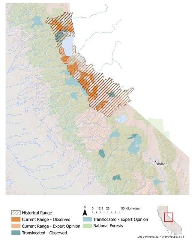 Lahontan Cutthroat trout persist in less than 5% of their original stream habitat and a mere 0.4% of their original lake habitat in California. Wild, self-sustaining populations in headwater streams in California likely total only a few hundred fish each, with the possible exception of the Upper Truckee River. Local extirpations of isolated populations likely occurred during California’s historic drought from 2012 -2016, further reducing the species’ remnant populations throughout their range. To help combat the continued declines, populations have been established in nine creeks outside of their native range in California through stocking from source populations and protected by man-made and natural barriers. With the help of many partners, alien species removal, especially of Rainbow and Brook trout in Slinkard and Silver creeks, has become an essential component of expanding the species’ range.